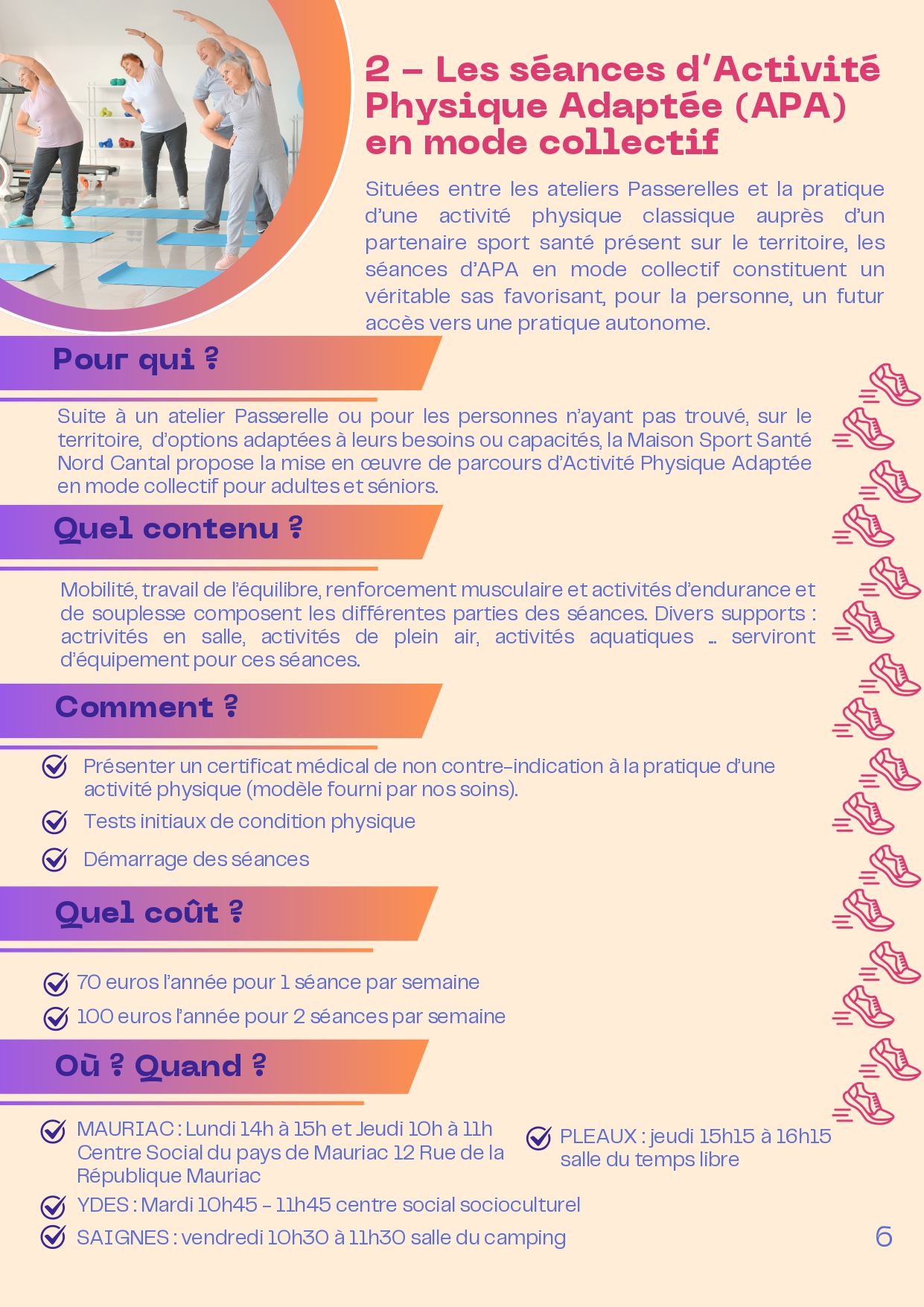Suite à un atelier Passerelle ou pour les personnes n'ayant pas trouvé, sur le territoire, d'options adaptées à leurs besoins ou capacités, la Maison Sport Santé Nord Cantal propose la mise en oeuvre de parcours d'Activité Physique Adaptée pour adultes et séniors.