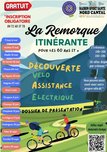 ![]() | ![]() Électrique pour les seniors du Nord Cantal ! ![]() Vous avez 60 ans ou plus ? Envie de bouger, de découvrir et de profiter d’une activité conviviale, accessible à tous ? La Maison Sport Santé Nord Cantal lance la Remorque Itinérante, un événement inédit pour tester gratuitement le vélo à assistance électrique (VAE) près de chez vous ! La remorque itinérante c'est 16 dates dans le Nord Cantal, 2 créneaux par date (14h-16h et 16h-18h) et 16 vélos disponibles par créneau. Vous pouvez également venir avec votre propre vélo à assistance électrique. Parcours faciles, encadrement pro, bonne ambiance garantie ! Inscription obligatoire au 04 71 68 37 78. Rejoignez-nous ! |